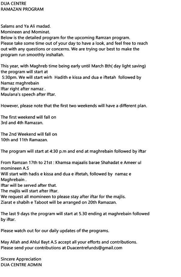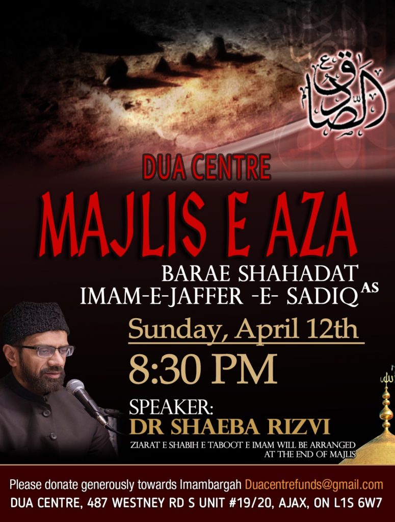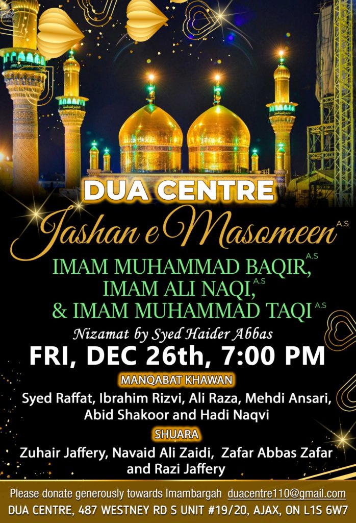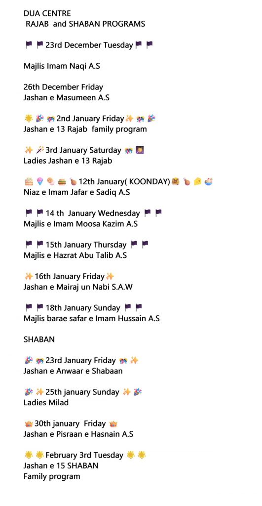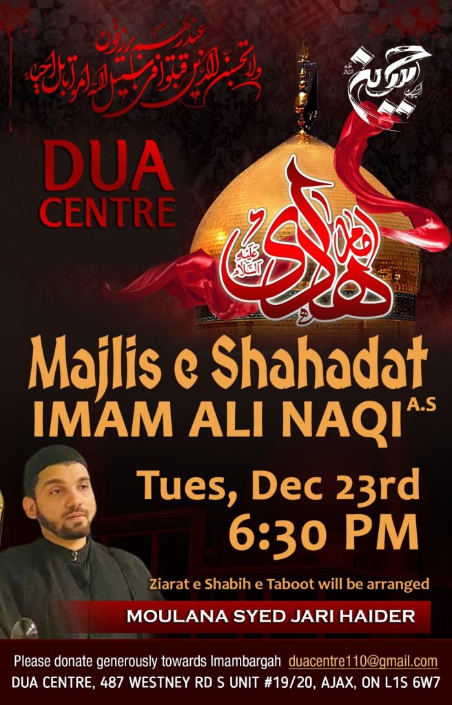 DUA Centre is a non-profit organization with a noble vision to unite the community under the message of peace in Islam. Guided by the teachings of the 14 Masumeen (a.s.), we celebrate, learn, and deepen our understanding of the religion. Our dedicated volunteers, inspired by ‘Our Imam-e-Zamana (a.t.f.s),’ work together to serve the divine personalities. In Durham region, we foster a vibrant community spirit based on support, compassion, and solidarity. DUA Centre stands as a testament to the remarkable unity within the community.